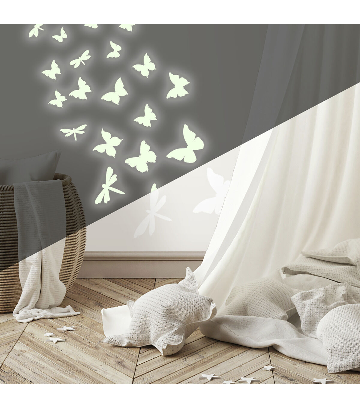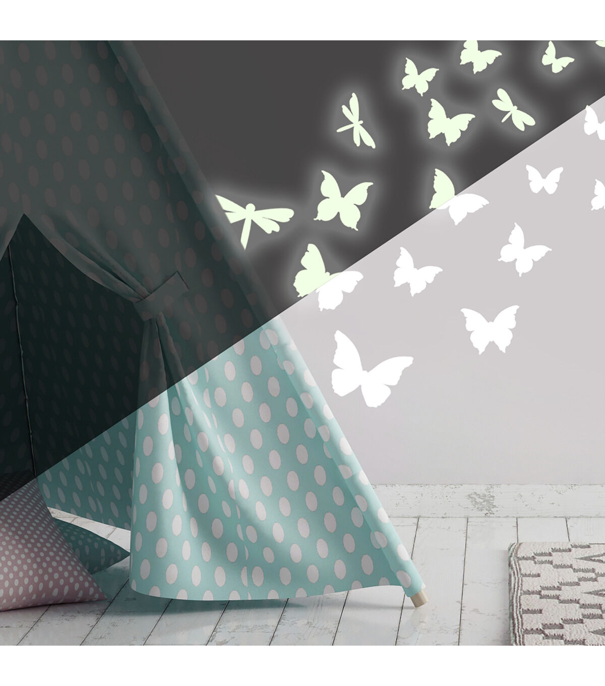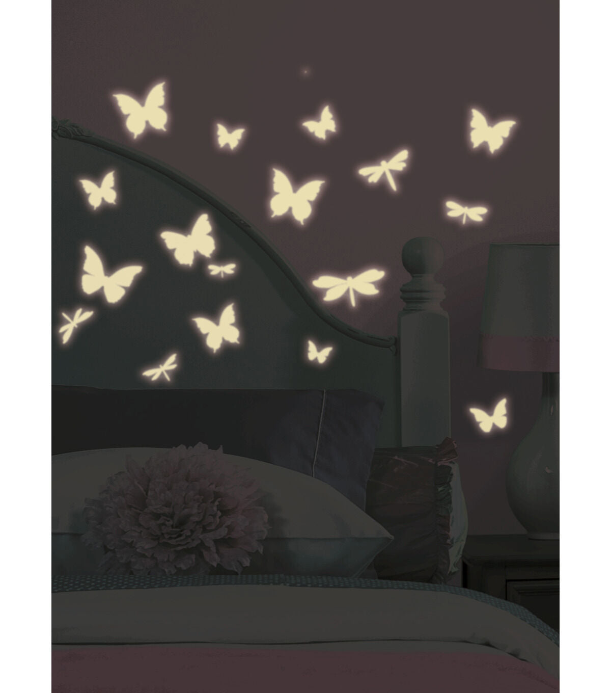 Light up the night with these beautiful butterflies and darting dragonflies. By day, these wall stickers may look like ordinary white decals... but in the dark, each of the 80 elements emits a special glow! To use, expose them to a bright light, then stick them to your wall. Each decal is removable and repositionable, so there's no need to worry about getting them perfect on the first try. By night or in the dark, your room with glow with the soft light of friendly butterflies and dragonflies! Pair with our glow-in-the-dark celestial set for even more fun on ceilings, walls, and other flat surfaces.